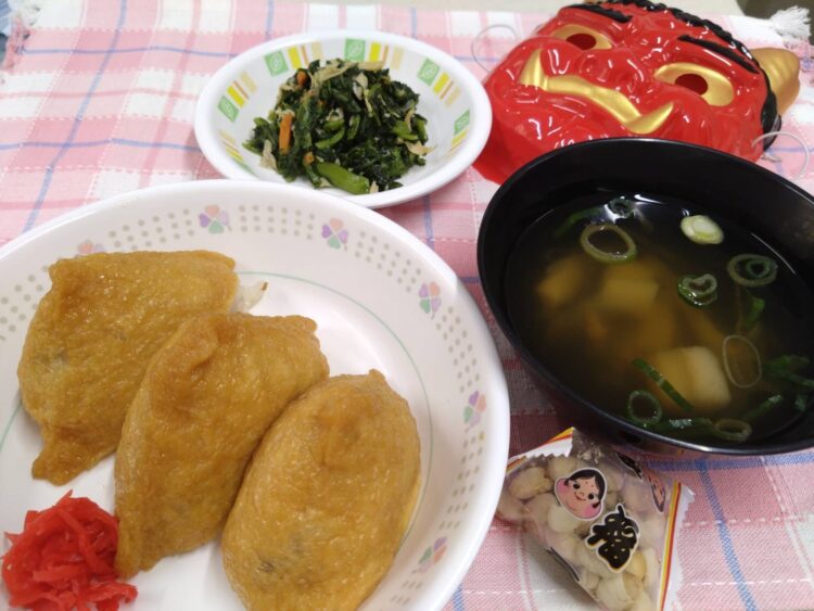 副菜:すまし汁、春菊と湯葉のおひたし、節分福豆